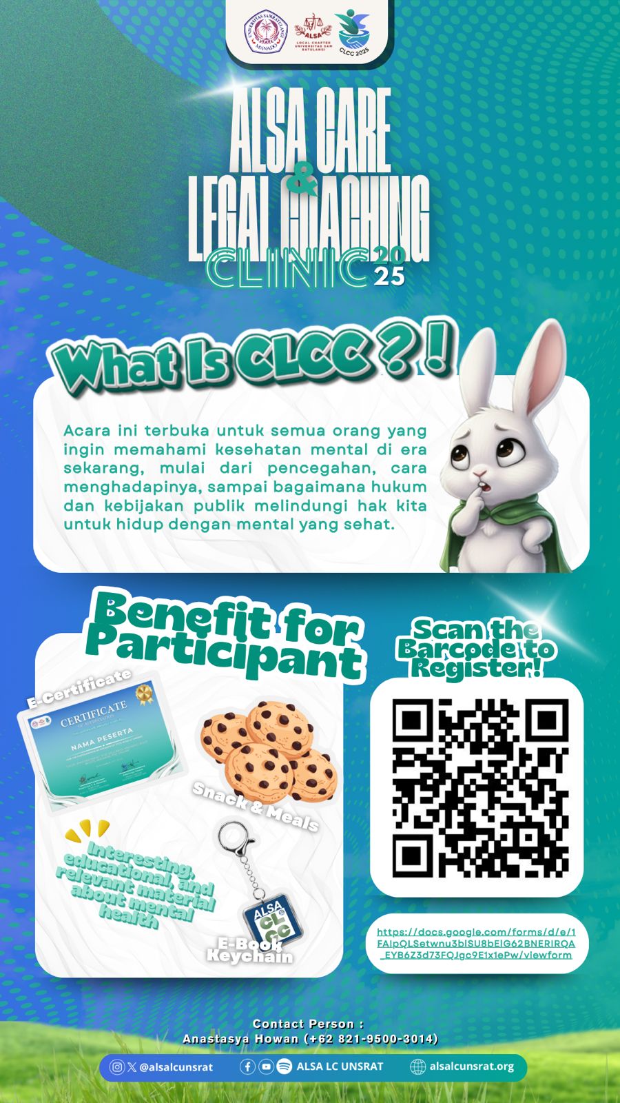 Melalui ALSA CARE & Legal Coaching Clinic 2025, ALSA LC UNSRAT mengajak masyarakat untuk lebih peduli, lebih sadar, dan lebih berani memperjuangkan hak atas kesehatan mental sebagai bagian penting dari kualitas hidup yang sehat dan berkeadilan.