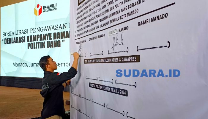 Manado, Sudara.id – Sosialisasi pengawasan Bawaslu Kota Manado digelar dalam bentuk deklarasi kampanye damai dan berintegritas untuk pemilu 2024 di Sintesa Peninsula Hotel, Manado, Jumat (22/12/2023) pagi.