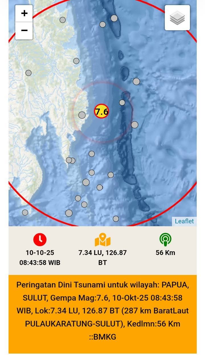 Jakarta, sudara.id – Badan Meteorologi, Klimatologi, dan Geofisika (BMKG) mengeluarkan peringatan tsunami untuk beberapa wilayah di Indonesia bagian timur setelah terjadinya gempa bumi berkekuatan magnitudo 7,6 yang mengguncang wilayah Mindanao, Filipina, pada Jumat, 10 Oktober 2025 pukul 09.43 waktu setempat.