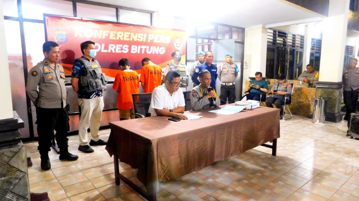 Dengan demikian tersangka yang sudah diamankan hingga rilis ini disampaikan berjumlah 9 orang, dengan perincian 4 tersangka untuk penganiayaan atas nama Anto dengan TKP di Sari Kelapa dan 5 tersangka untuk penganiayaan yang menyebabkan korban meninggal dunia atas nama Elvis Wagey (64) di jalan Sudirman Kota Bitung dengan total barang bukti yang diamankan sekitar 42 buah, 5 di antaranya senjata tajam jenis parang, pedang samurai, badik, dan anak panah serta 2 buah kayu.
