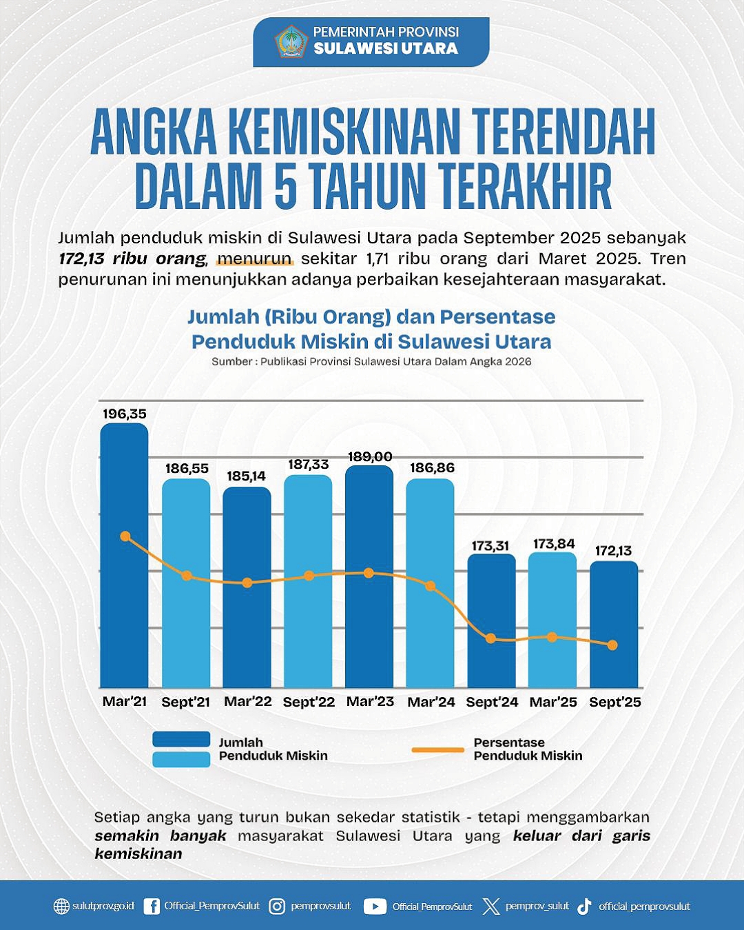 Sementara itu di sisi sosial, duet YSK-Victory berhasil membuktikan komitmen kesejahteraan melalui penurunan angka kemiskinan yang konsisten. Per September 2025, jumlah penduduk miskin di Sulut tercatat sebanyak 172,13 ribu orang.