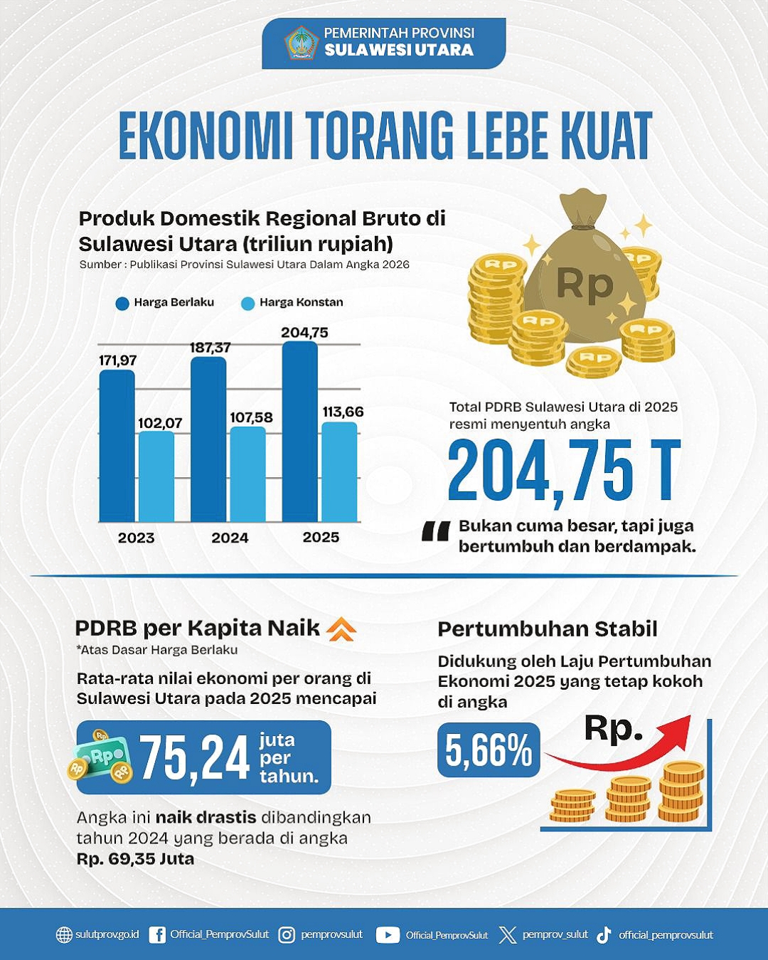 Data resmi menunjukkan Produk Domestik Regional Bruto (PDRB) Sulut atas dasar harga berlaku pada tahun 2025 berhasil menyentuh angka Rp204,75 Triliun. Pertumbuhan ekonomi daerah ini tercatat stabil di angka 5,66%, sebuah sinyal positif bagi iklim investasi di Indonesia Timur.