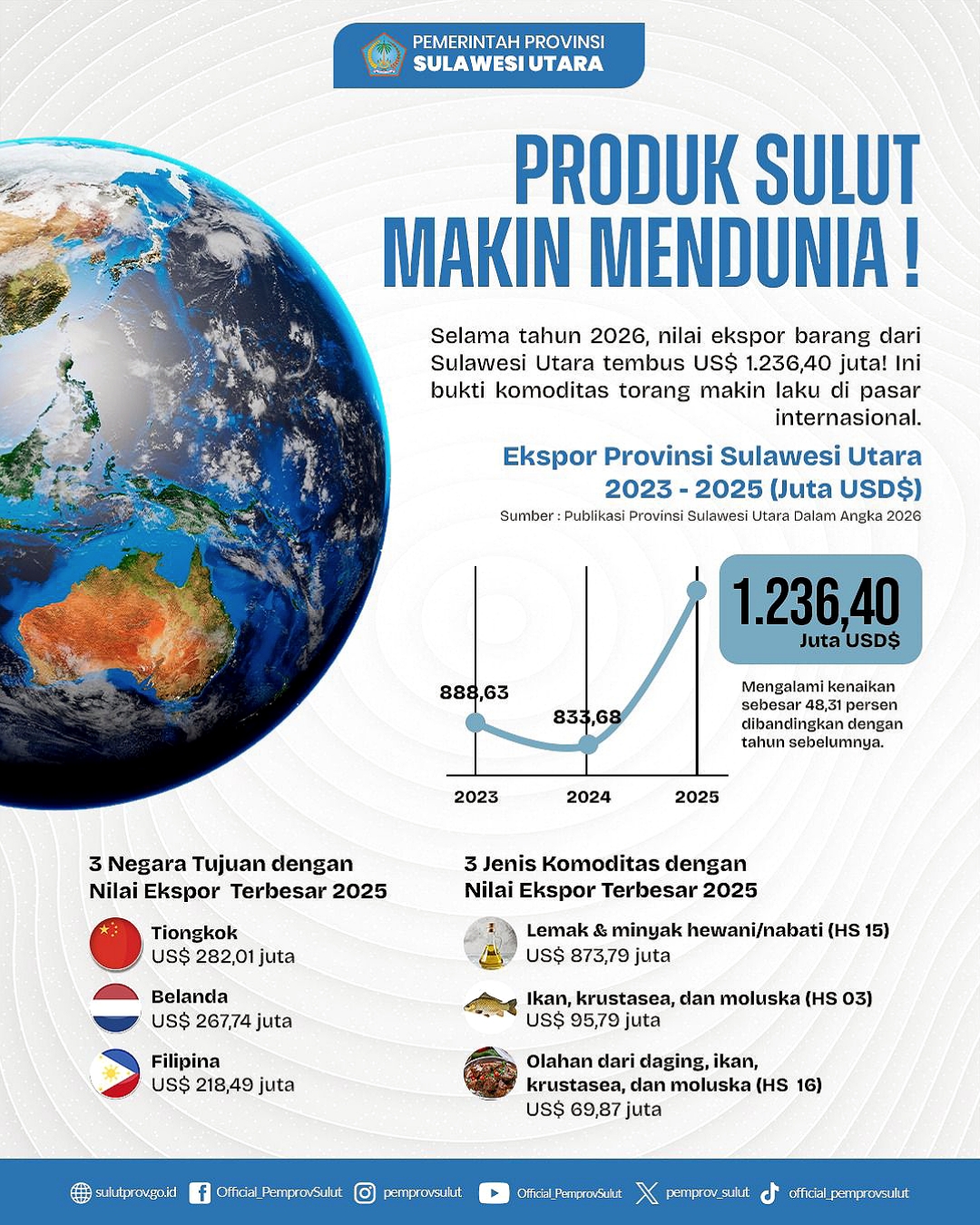 Sektor perdagangan luar negeri menjadi motor penggerak utama. Sepanjang tahun 2025, nilai ekspor Sulawesi Utara menembus US$ 1.236,40 juta, atau tumbuh drastis sebesar 48,31% dibandingkan tahun sebelumnya.