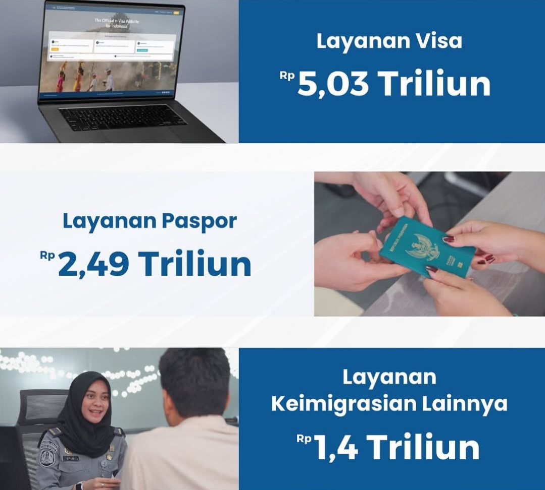Sebagaimana yang disampaikan Menteri Imigrasi dan Pemasyarakatan, Agus Andrianto, bahwa kontribusi terbesar PNBP berasal dari layanan visa sebesar Rp5,03 triliun, diikuti oleh layanan paspor sebesar Rp2,49 triliun, dan layanan keimigrasian lainnya sebesar Rp1,4 triliun.