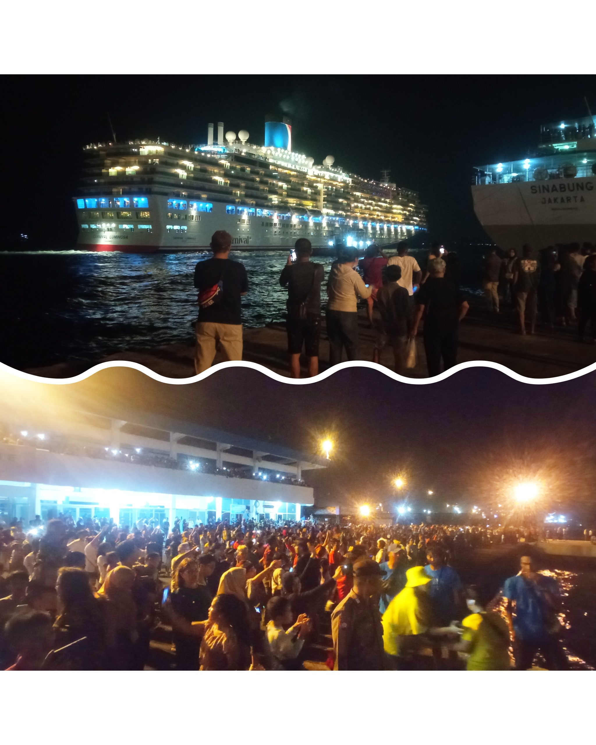 Selepas MV. Carnival Luminosa merenggangkan dirinya dari bibir dermaga, lautan manusia tumpah ruah merangsek ke dermaga. Pihak keamanan seolah tak berdaya menahan antusias para warga yang tidak mau melewatkan moment spesial ini.