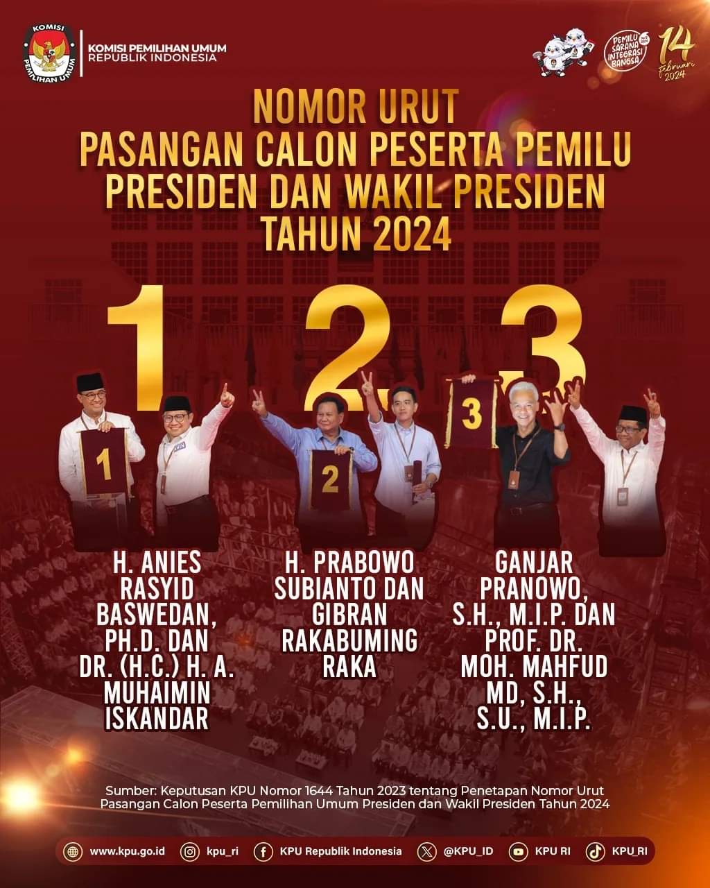 Jakarta, Sudara.id – KPU RI menetapkan nomor peserta bagi ke 3 kontestan pasangan Calon Presiden (Capres) dan Calon Wakil Presiden (Cawapres) untuk Pemilihan Presiden (Pilpres) Indonesia pada Pemilihan Umum (Pemilu) tahun 2024 di kantor KPU RI, Selasa (14/11/2023).