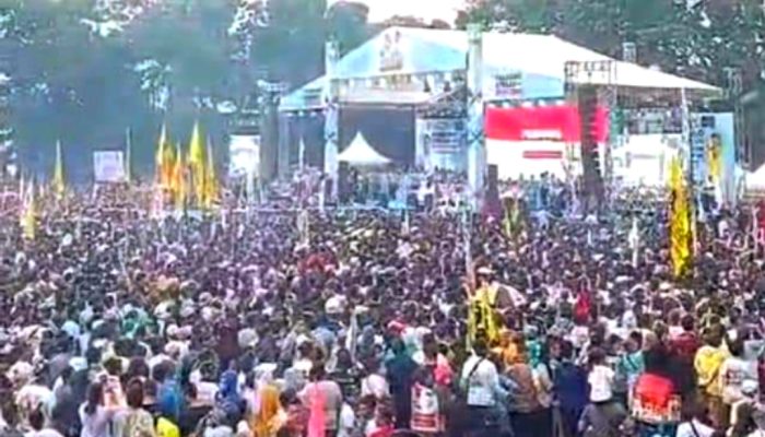 Sementara itu di seputaran Lapangan KONI sendiri, gelombang massa yang diperkirakan mencapai ratusan ribu orang itu, terpantau berdesak-desakan tanpa jeda dan mengular tidak hanya dijalan protokoler tapi juga sampai memenuhi setiap celah jalan dan lorong yang ada di seputaran lokasi, berusaha mencari posisi yang tepat (hot spot) sambil menunggu Sang Calon Presiden tiba.