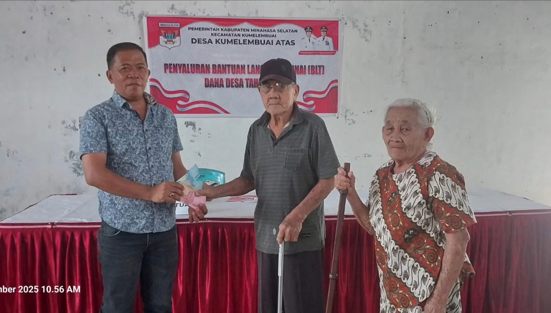 “Ini kado Natal dan Tahun Baru 2026 bagi para KPM, ” ujar Penjabat Hukum Tua Desa Kumelembuai Atas Jans Lazarus Liando SE, saat menyerahkan BLT kepada para KPM.