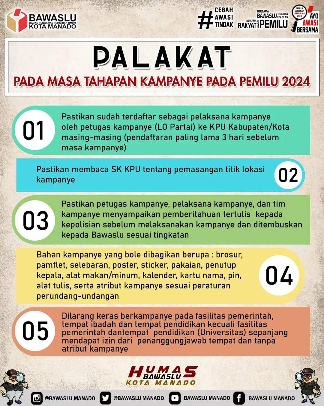 Manado, Sudara.id – Bawaslu Kota Manado merilis palakat yang menjadi panduan praktis bagi Partai Politik (Parpol) dan para calon legislatif peserta pemilu 2024 di Kota Manado selama masa kampanye yang berlangsung sejak tanggal 28 November 2023.
