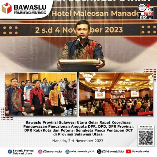 Manado, sudara.id – Bawaslu Sulut menggelar Rakor Pengawasan Pencalonan Anggota DPR, DPD, DPRD Provinsi dan DPRD Kab/Kota terkait potensi sengketa pasca penetapan DCT di Provinsi Sulut bertempat di Swissbell-Hotel Maleosan, 2-4 November 2023.