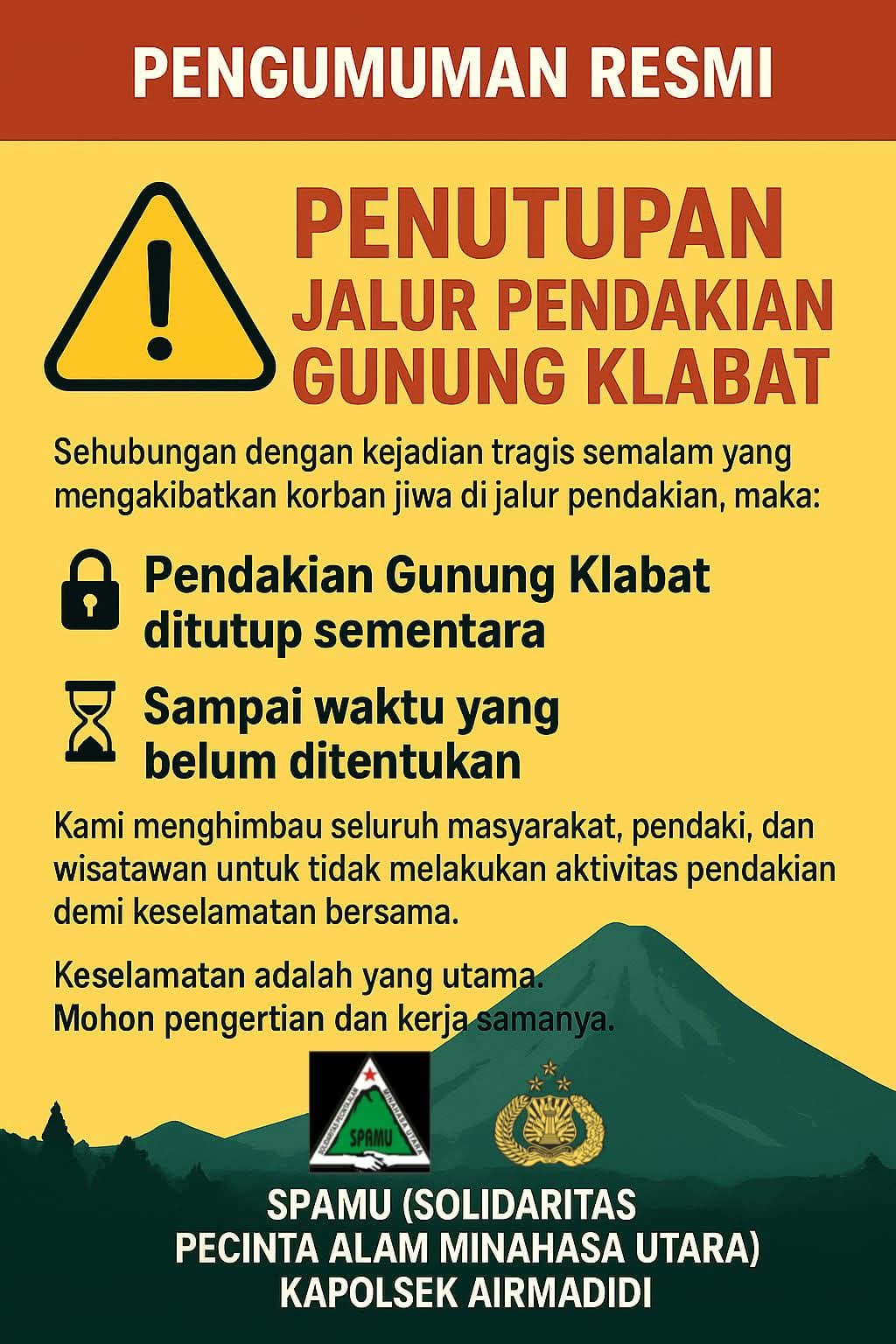 Keputusan ini diambil menyusul insiden tragis yang menewaskan seorang pendaki bernama Yohanes Piay warga Jalan Sea Kecamatan Malalayang Manado, pada Jumat malam, 15 Agustus 2025.