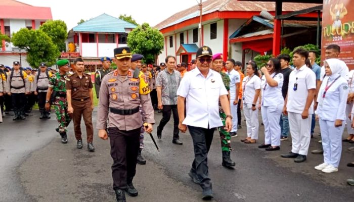 Kapolres Bitung AKBP Albert Zai saat apel pergeseran pasukan (Serpas) Pengamanan TPS (Pam TPS) Kota Bitung di Lapangan Kantor Walikota Bitung, Minggu (11/2/2024) (Foto: Istimewa)