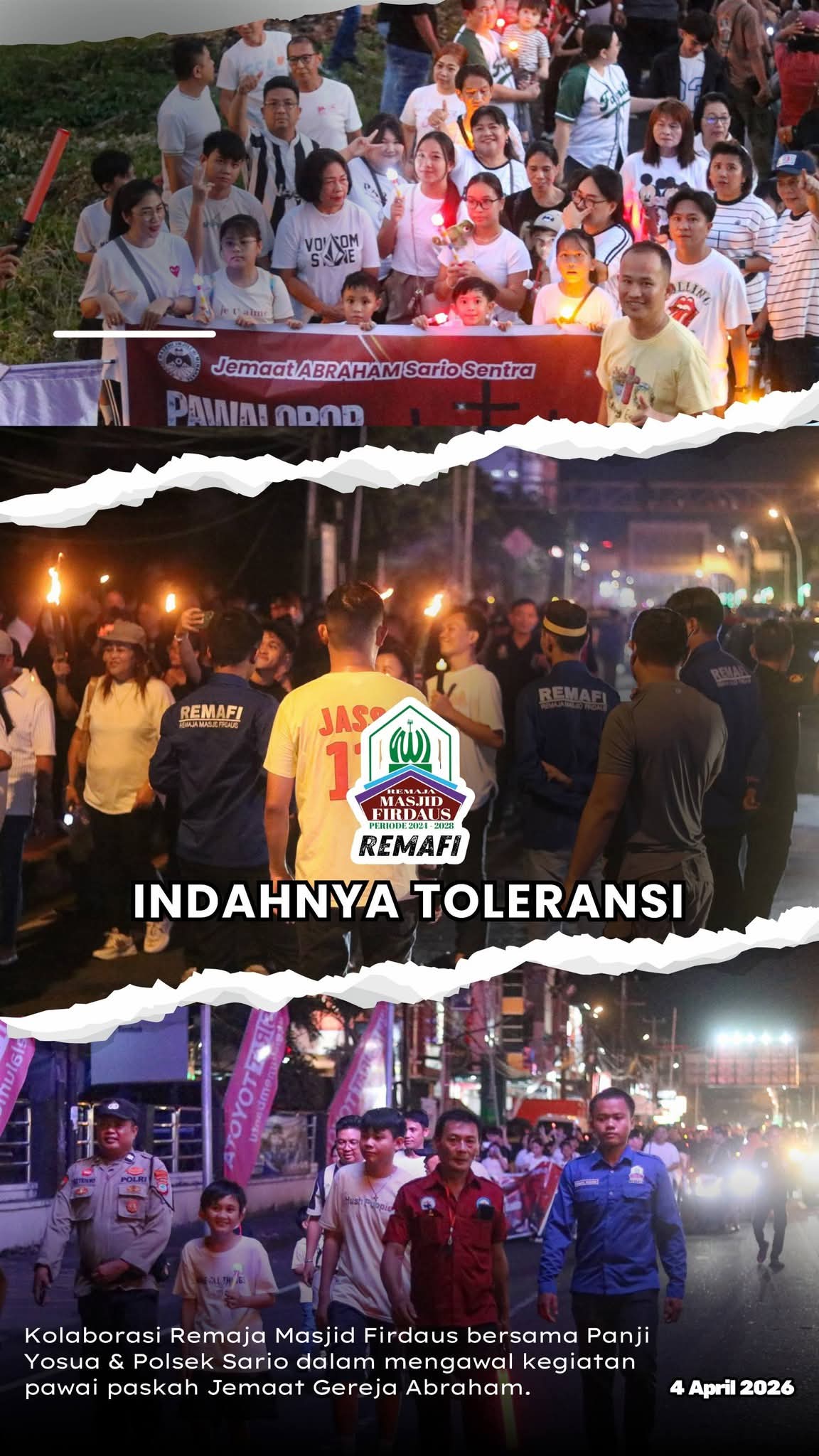 Manado, sudara.id – Semangat toleransi antarumat beragama kembali ditunjukkan di Manado. Remaja Masjid Firdaus Boulevard bersama Panji Yosua turut ambil bagian dalam pengamanan Pawai Paskah Jemaat Gereja Abraham Sario, Sabtu (4/4/2026).