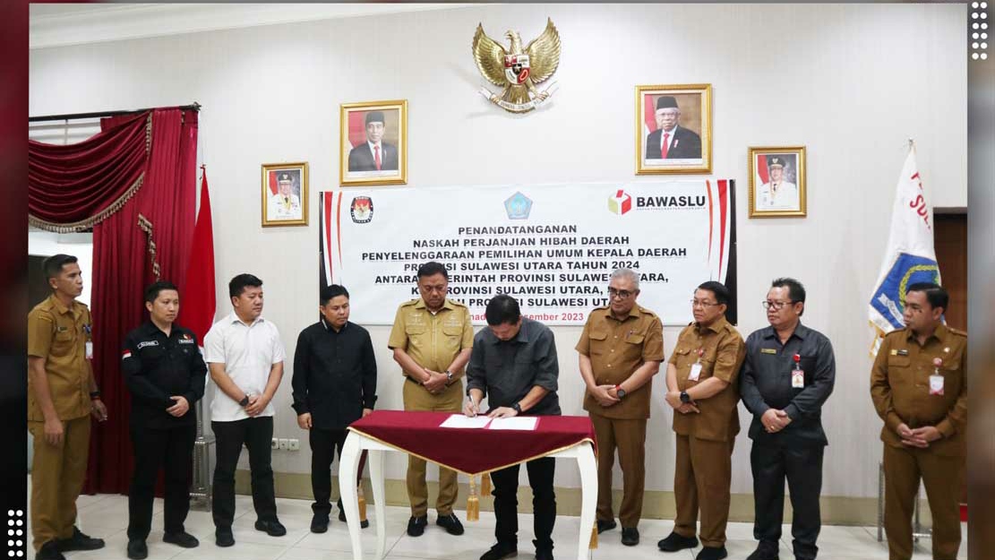 Manado, SUDARA.CO.ID – Gubernur Provinsi Sulawesi Utara (Sulut) Olly Dondokambey resmi menandatangani Naskah Perjanjian Hibah Daerah (NPHD) dengan Bawaslu Provinsi Sulawesi Utara di Ruang Rapat VIP Bandara Sam Ratulangi Manado, Selasa (12/12/2023).